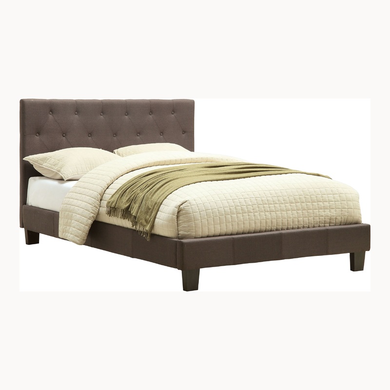 Contemporary stylePadded headboard with button tuftingTightly upholstered in gray fabric IncludesEuropean style slat kitEspresso finished block feetFinish: Gray Prop 65?:Yes, Wood DustProduct Materials: Linen-Like Fabric, Solid WoodAssembly Required?:YesCo